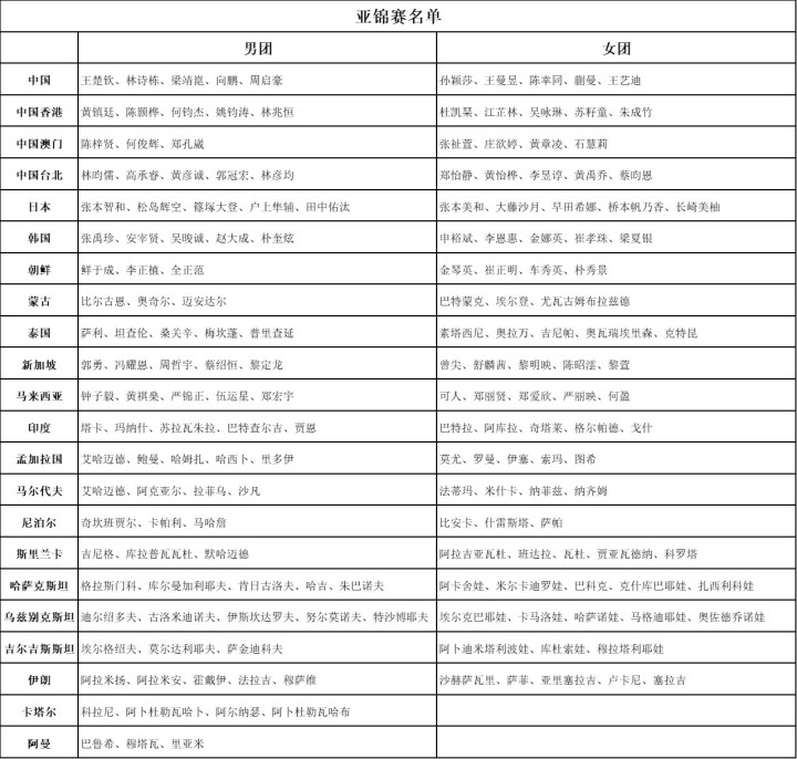 至于伊朗男团与泰国女团的水平比较高,哈萨克斯坦男团也具备一定冲击力,新加坡有底蕴但现在大不如从前,其余队伍缺乏实力较强的对手,原本许多球迷想看看瑞典世界冠军佩尔森执教的沙特阿拉伯队出战但未能如愿,以下为目前报名的球队及其运动员名单: